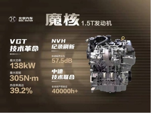 北京汽车这款获奖的魔核动力1.5T发动机,采用了VGT增压器技术,在参数上表现出色,拥有138 kW最大功率、305 N.m最大扭矩,动力媲美合资同排量产品。而高达39.2%的超高热效率,仅为57.5dB的怠速噪音也都是这款发动机的亮点。