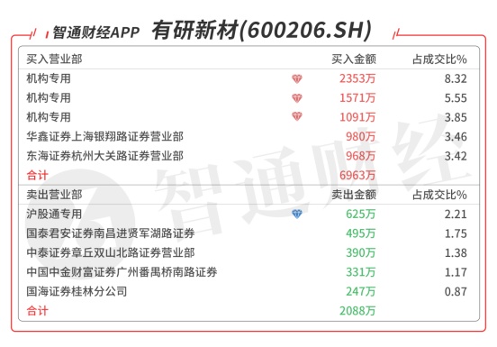 有研新材(600206.SH):受到众多机构青睐,今日共三个机构席位出现在龙虎榜单上,分别列买一,买二,买三,合计买入5014万元,深股通卖出625万元,当日净买入4875万元,该股今日底部首板,强势突破年线涨停,预计压力位在60日线附近。