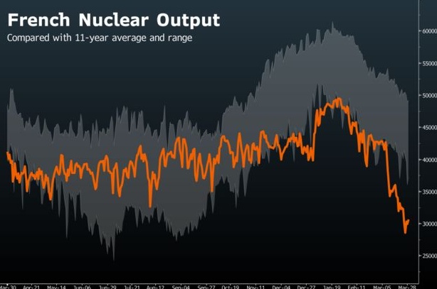法国核电站的问题如此严重,以至于在3月份,这个欧洲最大的电力出口国变成了一个电力净进口国。法国电力公司(Electricite de France SA)的56个反应堆中,目前只有30个在运行。