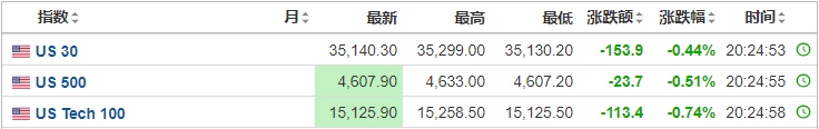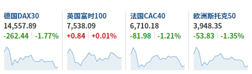 2. 截至发稿,德国DAX指数跌1.77%,英国富时100指数涨0.01%,法国CAC40指数跌1.21%,欧洲斯托克50指数跌1.35%。