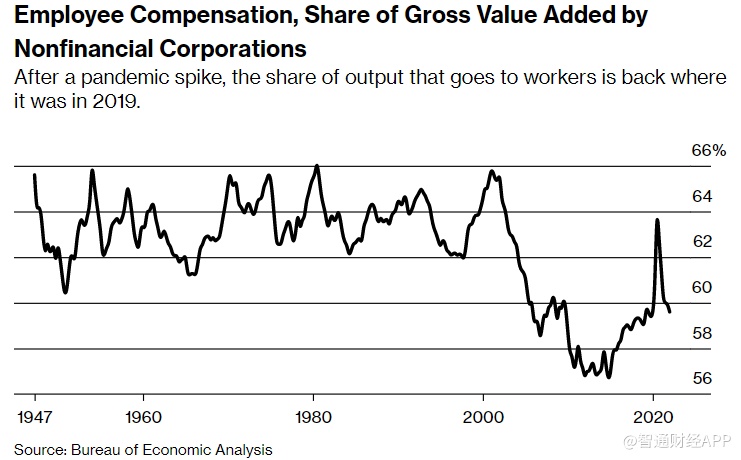 对员工来说,2021年也是不错的一年。员工薪酬上升了11%,但所谓的国民收入中的劳动份额(作为工资和薪水支付的部分)回落到疫情前的水平。这可能会削弱美联储支持的观点,即不断飙升的劳动力成本是导致当前通胀飙升的原因。