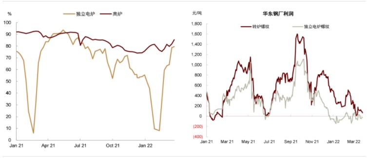 图表: 电炉、高炉产能利用率与螺纹钢利润