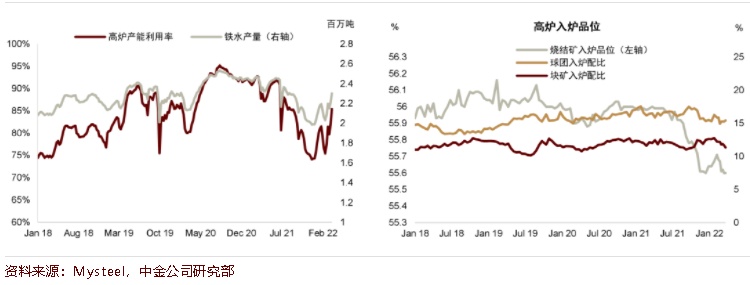 图表: 高炉产能利用率与铁水产量及高炉入炉品位