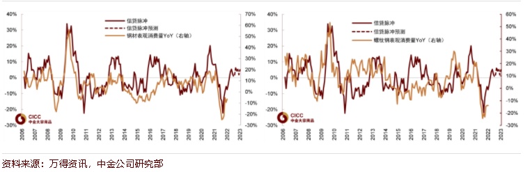 图表: 信贷脉冲与钢材、螺纹钢表观消费量的同比变化(信贷脉冲右移5个月)