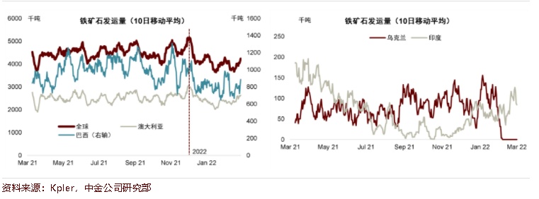 一方面,今年以来全球海运铁矿石的发运量出现了显著下滑,特别是巴西铁矿石主产区受暴雨影响,物流受到一定扰动。澳大利亚铁矿石的发运量也有一定下滑。另外,俄、乌局势事态升级对铁矿石供应的影响也不容忽视。两国合计约占全球铁矿石产量的8%。随着价格走强,我们看到印度等地的边际生产商的出口量也有所增长。
