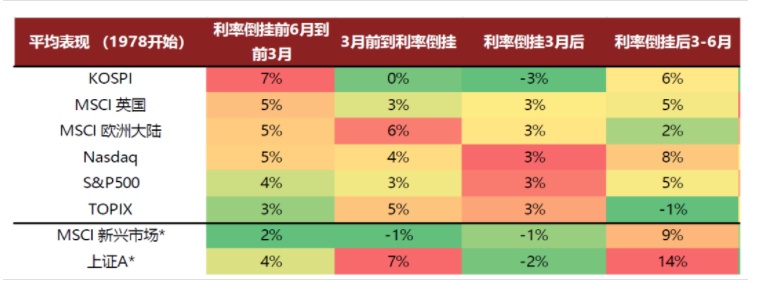 图表10:利率倒挂期间,新兴市场表现较差,倒挂后3-6月纳斯达克和新兴市场表现更好