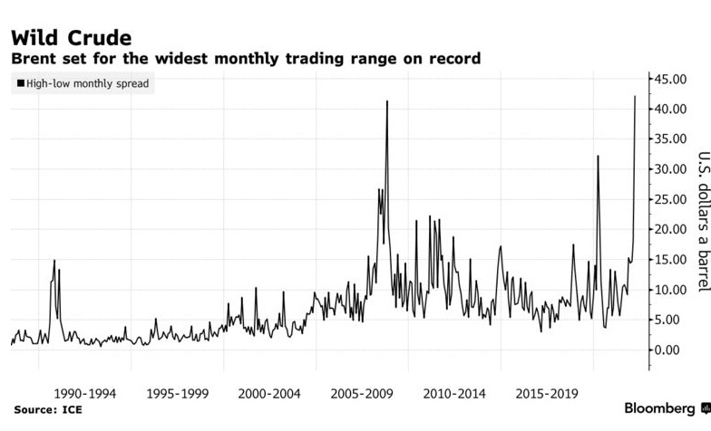 布伦特原油价格将创下有记录以来的最大的月度价格区间