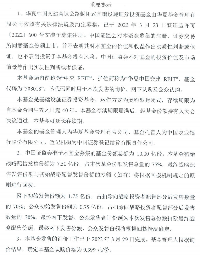 智通财经APP获悉,3月31日,华夏基金发布公告,旗下华夏中国交建REIT(基金代码“508018”)将于2022年4月7日正式发售,基金份额发售价格为9.399元/份,发售总份额为10亿份,预计募集总规模为93.99亿元。基金募集期自2022年4月7日起至2022年4月8日止。若顺利完成募集,华夏中国交建REIT将成为目前市场上规模最大的公募REITs。
