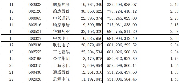 以兴全合润混合(LOF)为例,该基金中隐形重仓股包括鹏鼎控股(002938.SZ)、韵达股份(002120.SZ)、中兴通讯(603816.SH)、顾家家居(603816.SH)、华海药业(600512.SH)、中颖电子(300327.SZ)、联创电子(002036.SZ)、三七互娱(002555.SZ)、公牛集团(603195.SH)、上海家化(600315.SH)、通威股份(600438.SH)、思源电气(002028.SZ)等,上述股票占基金净值比均超1.6%。