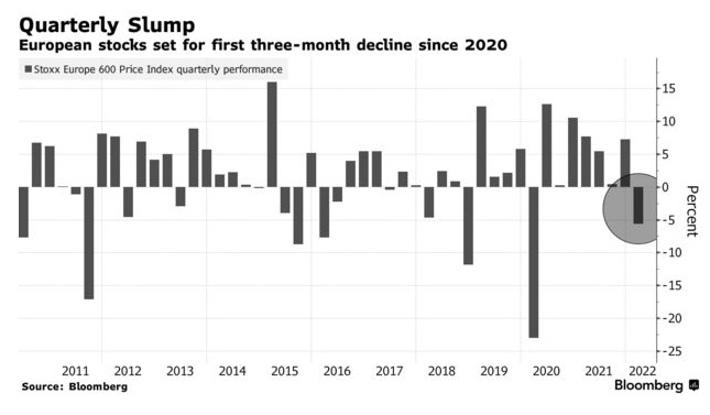 因俄乌冲突引发的经济不确定性和高企的通胀影响了投资者对风险资产的兴趣,欧洲股市将出现自2020年新冠疫情初期以来的首次季度下跌。