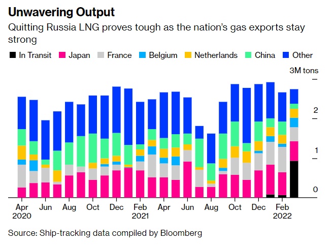 智通财经APP获悉,自俄乌冲突以来,俄罗斯液化天然气(LNG)出口一直保持旺盛,这表明包括来自法国、日本的买家都不愿该国停止供应LNG。