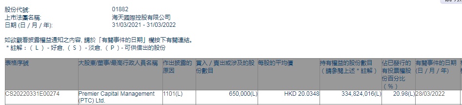 智通财经APP获悉,香港联交所最新资料显示,3月28日,Premier Capital Management (PTC) Ltd.增持海天国际(01882)65万股,每股作价20.0348港元,总金额约为1302.26万港元。增持后最新持股数目约为3.35亿股,最新持股比例为20.98%。