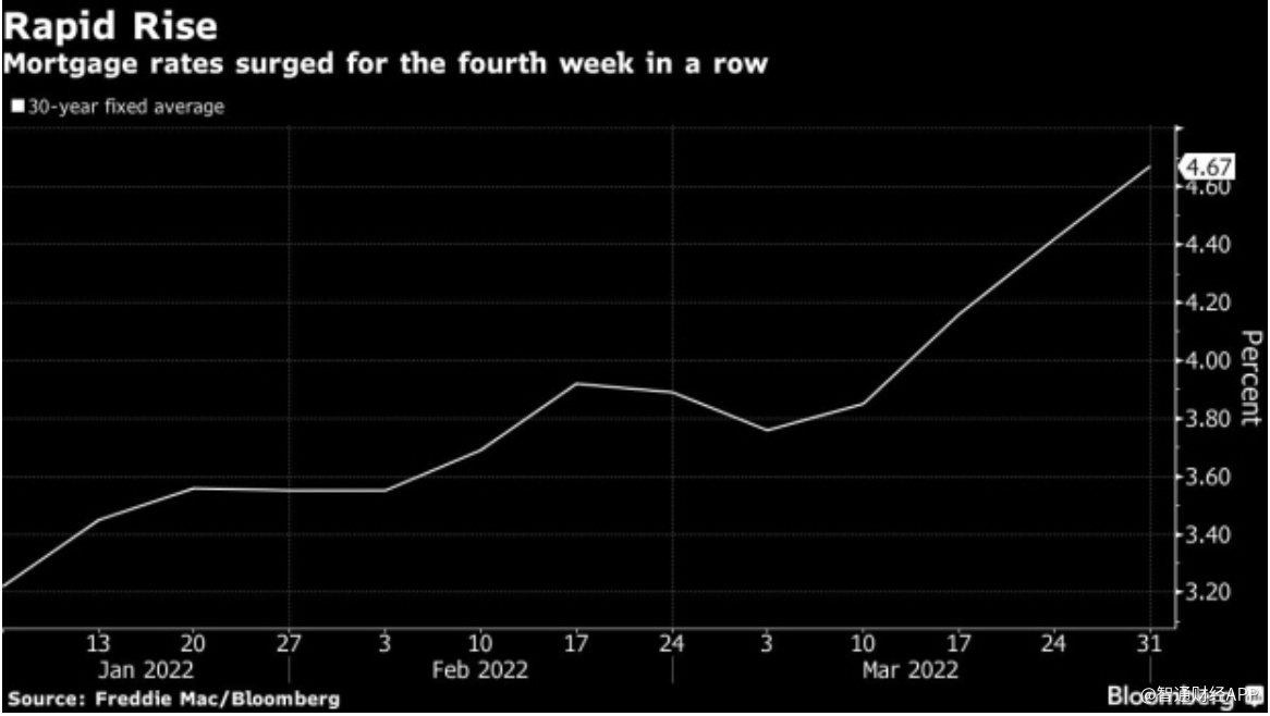 智通财经APP获悉,周四,房地美表示,美国30年期固定利率贷款的平均利率跃升至4.67%,为自2018年12月以来的最高单周数据。