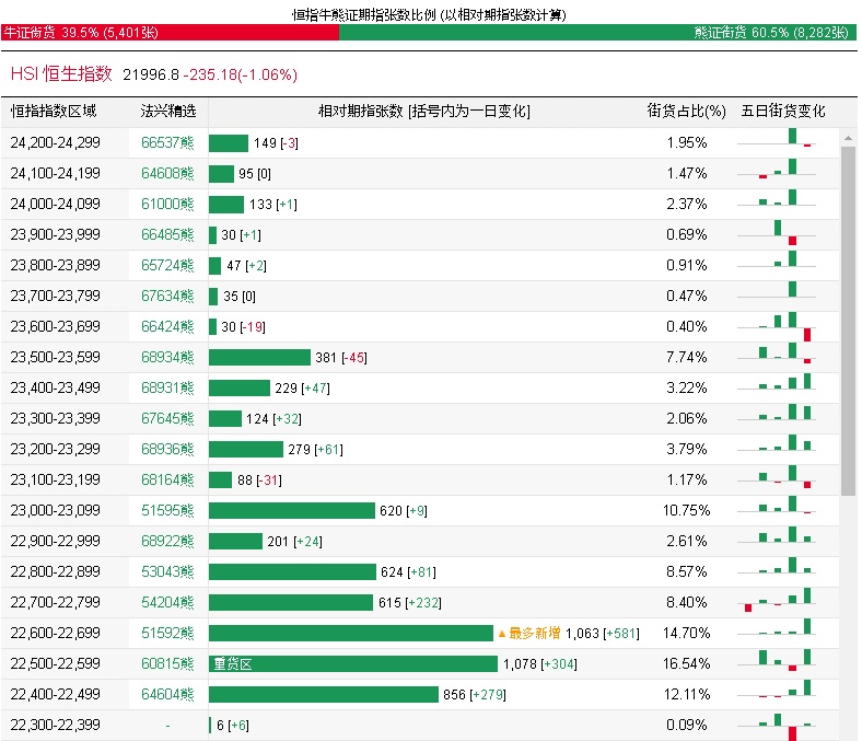 法兴恒指牛熊证街货分布图中的数据显示,熊证街货重货区在22500-22599区间,该区间最新熊证数量为1078张,较上一交易日增加304张;最多新增在22600-22699区间,该区间最新熊证数量为1063张,较上一交易日增加581张。