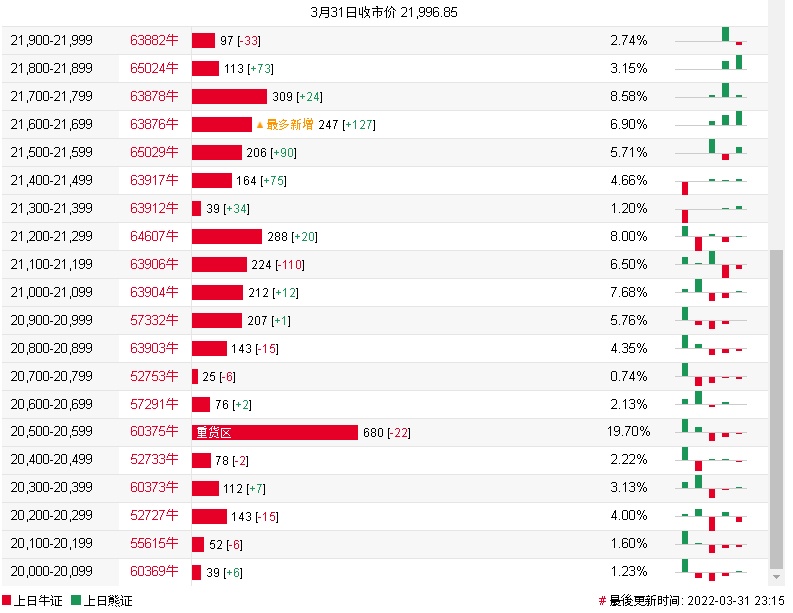 牛证街货重货区在20500-20599区间,该区间最新牛证数量为680张,较上一交易日减少22张;最多新增在在21600-21699区间,该区间最新牛证数量为247张,较上一交易日增加127张。