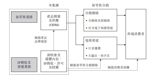 公司亦经营IP创造及营运业务,主要是为了赋能公司的新零售业务。公司的IP创造及营运业务包括IP创造、媒体内容创造及活动策划。通过建立公司独有的明星IP及相关的媒体内容及活动,公司建立公司独有的明星IP的粉丝社区,它们活跃于以独有的明星IP为中心的私域流量中。因此,公司的产品于有关社区及私域流量的推广及销售乃由公司的明星IP赋能。