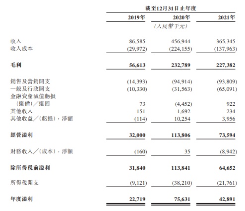 于2019年、2020年及2021年,巨星传奇收入分别为8658.5万、约4.57亿、约3.65亿元人民币。同期,年内溢利分别为2271.9万、7563.1万、4289.1万元人民币。
