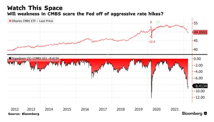 McDonald在近期的Bear Traps Report视频上表示:“目前各方对美联储的加息预期相当激进,而尽管目前只上调了一次联邦基金利率,但信贷市场方面已“高度预计”,美联储今年会有七次加息,每次幅度为25个基点。更不用说一些经济学家预测美联储今年将进行8-9次的加息。”他认为,信贷风险的激增可能会影响美联储加息的选择,并以iShares CMBS ETF为例来说明他的观点。