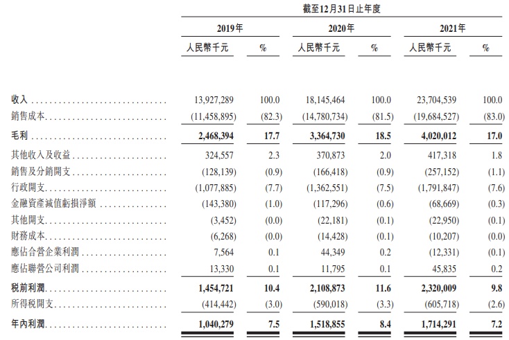 于2019年、2020年及2021年,万物云收入分别约为139.27亿元、181.45亿元、237.05亿元人民币。同期,年内利润分别约为10.40亿元、15.19亿元、17.14亿元人民币。
