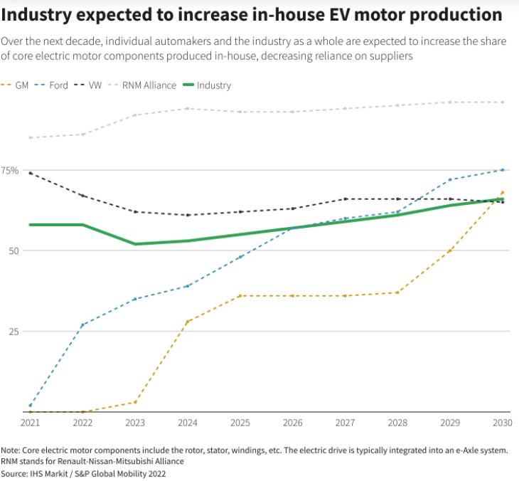 汽车制造商在矿山、电机和电池领域的投资,与数十年来将开发和生产控制权交给供应商的做法不同,后者可以为多家汽车制造商以更大的规模和更低的成本生产半导体和电子元件等。