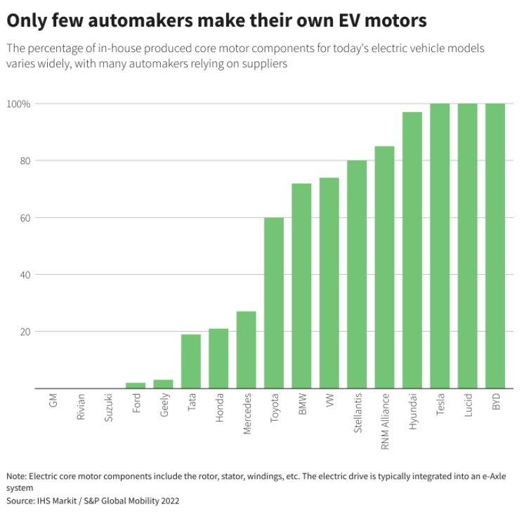据IHS Markit称,目前,只有特斯拉、电动汽车初创公司Lucid和比亚迪 (002594.SZ)完全自主生产电动汽车,其次是现代汽车和雷诺-日产-三菱联盟。其他汽车制造商,包括梅塞德斯-奔驰集团、福特和保时捷,都在使用供应商提供的电动汽车。