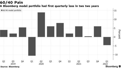 截至周三,Bloomberg一个追踪60%股票和40%固定收益证券的投资组合的模型下跌了4.6%,几乎肯定会出现两年来的首次季度亏损。