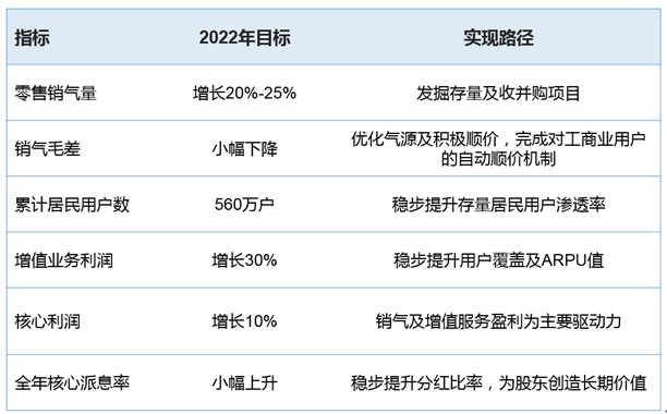 2022年度业绩指引中,公司将通过发掘存量用户潜力及收并购项目,实现零售销气量20%-25%的同比增长;将继续优化气源及积极顺价,达成2022年综合毛差小幅下降目标;累计居民用户数560万户,净增70万户;通过稳步提升用户覆盖及ARPU值,实现增值业务利润同比增长30%的目标;对比2021年毛差大幅下降以及一次性自然灾害等各类基数,公司预计2022年将实现核心利润同比增长10%。派息方面,2022年公司将继续维持小幅上升的派息率指引,稳健提升分红比率,持续为股东创造长期价值。