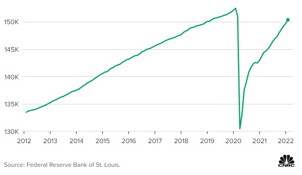 美联储已经认定,就业市场已经足够强劲,足以让它把重点转向抗击通胀。美联储在本月宣布加息25个基点,这是自2018年以来的首次加息。经济学家预计,美联储可能会进一步加快收紧政策的步伐,在5月份加息50个基点。美联储公布的点阵图显示,年内还会进行六次25个基点的加息。