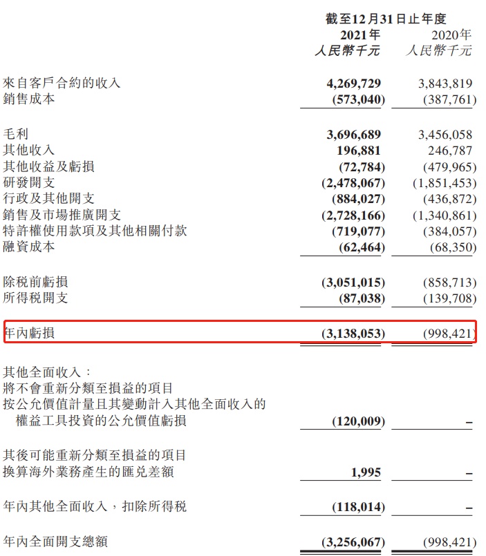 最后说年轻的康方生物,年内实现产品及许可费销售总额约人民币3.4亿元,2020年为零;毛利1.94亿元,2020年同样为零;研发开支11.23亿元,同比增长约46.1%;年内亏损12.58亿元,同比减少4.7%。PD-1单抗派安普利单抗自2021年8月末开始销售以来,一个季度达成产品销售额2.12亿元。三个月破2亿,当然还得归功于好伙伴——正大天晴。