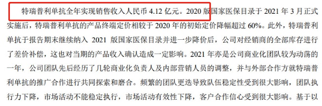 产品端的特瑞普利单抗全年收入4.12亿,较20年下降59%,销量仅增长17%,公司个出的解释是因为特瑞普利单抗进入医保后终端价格下降超过60%,期内补偿了经销商的库存差价,因此综合收入减少约59%。