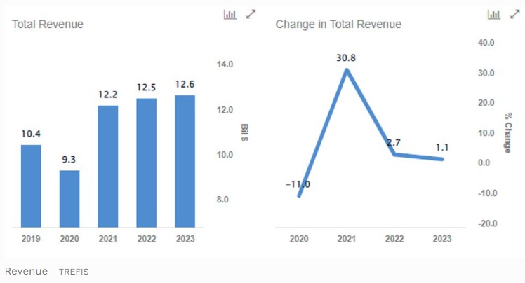 2021年,由于被压抑的需求和俄乌冲突的不确定性导致氧化铝和铝价格上涨,美国铝业总营收同比增长30%。其中,该公司的铝土矿、氧化铝和铝业务分别占总销售额的2%、26%和72%。