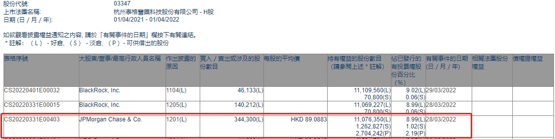 智通财经APP获悉,香港联交所最新资料显示,3月28日,小摩减持泰格医药(03347)34.43万股,每股作价89.0883港元,总金额约为3067.31万港元。减持后最新持股数目约1107.64万股,最新持股比例为8.99%。
