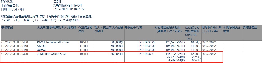 智通财经APP获悉,香港联交所最新资料显示,3月28日,小摩增持瑞声科技(02018)135.9844万股,每股作价 18.8731港元,总金额约为2566.45万港元。增持后最新持股数目约为1.46亿股,最新持股比例为12.09%。