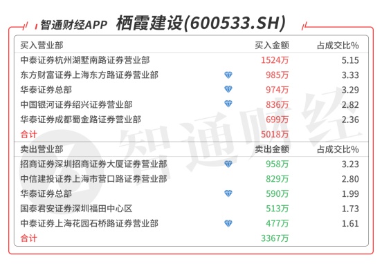 栖霞建设(600533.SH):多主力现身龙虎榜,机构席位对倒净买入384万元,买四是知名游资赵老哥的席位买入836万元,当日净买入1652万元,该股今日强势涨停,预计有溢价。