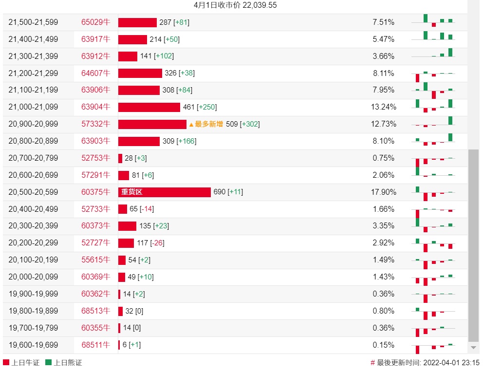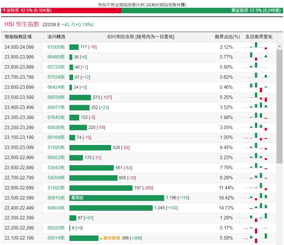 法兴恒指牛熊证街货分布图中的数据显示,熊证街货重货区在22500-22599区间,该区间最新熊证数量为1196张,较上一交易日增加118张;最多新增在22100-22199区间,该区间最新熊证数量为366张,较上一交易日增加366张。