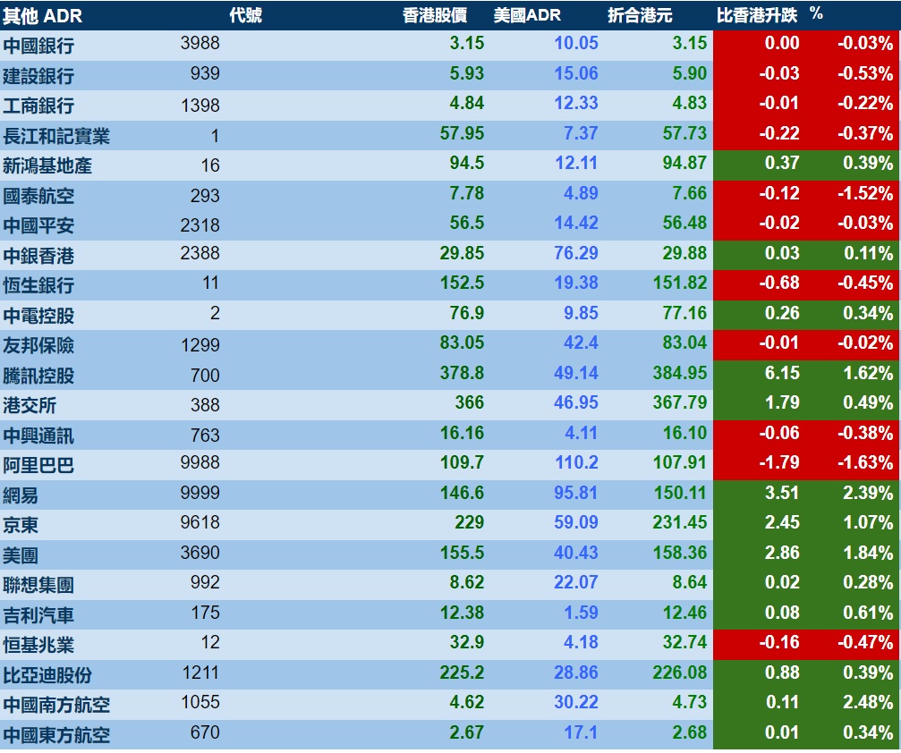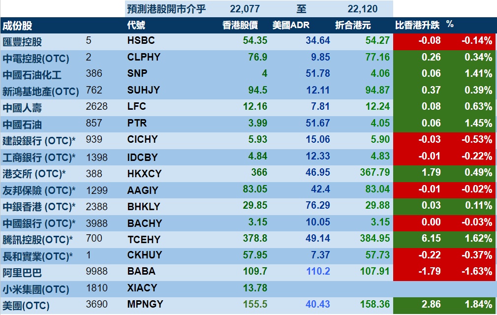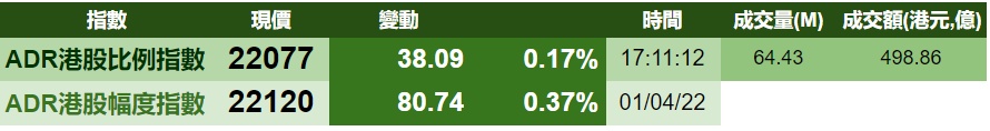 智通财经APP获悉,周四美股三大指数悉数上涨,港股ADR指数上涨,按比例计算,收报22077点,较香港收市涨38.09点或0.17%。