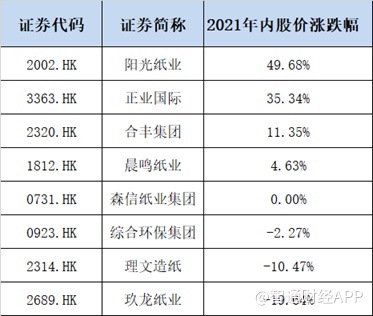 智通财经APP了解到,从港股诸多造纸企业的股价走势来看,2021年阳光纸业(02002)以累计49.68%的涨幅位居榜首。