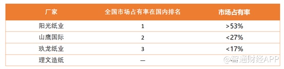 除世纪阳光纸业外,玖龙纸业、山鹰纸业、景兴纸业等多家包装纸生产企业都有生产线生产涂布白面牛卡纸。不过阳光纸业生产的125g 低定量涂布白面牛卡纸为全球独家生产。