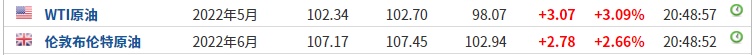 3. 截至发稿,WTI原油涨3.09%,报102.34美元/桶。布伦特原油涨2.66%,报107.17美元/桶。