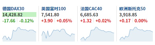 2. 截至发稿,德国DAX指数跌0.12%,英国富时100指数涨0.05%,法国CAC40指数涨0.02%,欧洲斯托克50指数涨0.00%。
