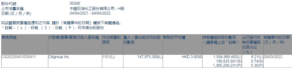 智通财经APP获悉,香港联交所最新资料显示,3月29日,Citigroup Inc.增持中石化(00386)1.48亿股,每股作价3.858港元,总金额约为5.71亿港元。增持后最新好仓持股数目约为15.85亿股,好仓持股比例为6.21%。