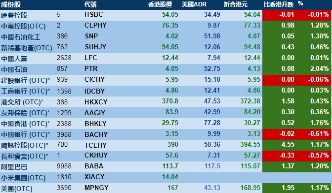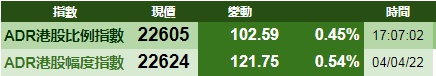 智通财经APP获悉,周一美股三大指数悉数上涨,港股ADR指数上涨,按比例计算,收报22605点,较香港收市涨102.59或0.45%。