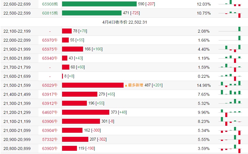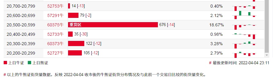 牛证街货重货区在20500-20599区间,该区间最新牛证数量为676张,较上一交易日减少14张;最多新增在在21500-21599区间,该区间最新牛证数量为487张,较上一交易日增加201张。