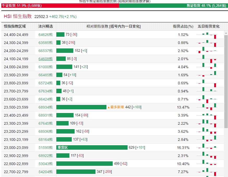 法兴恒指牛熊证街货分布图中的数据显示,熊证街货重货区在23000-23099区间,该区间最新熊证数量为629张,较上一交易日增加101张;最多新增在23500-23599区间,该区间最新熊证数量为442张,较上一交易日增加169张。