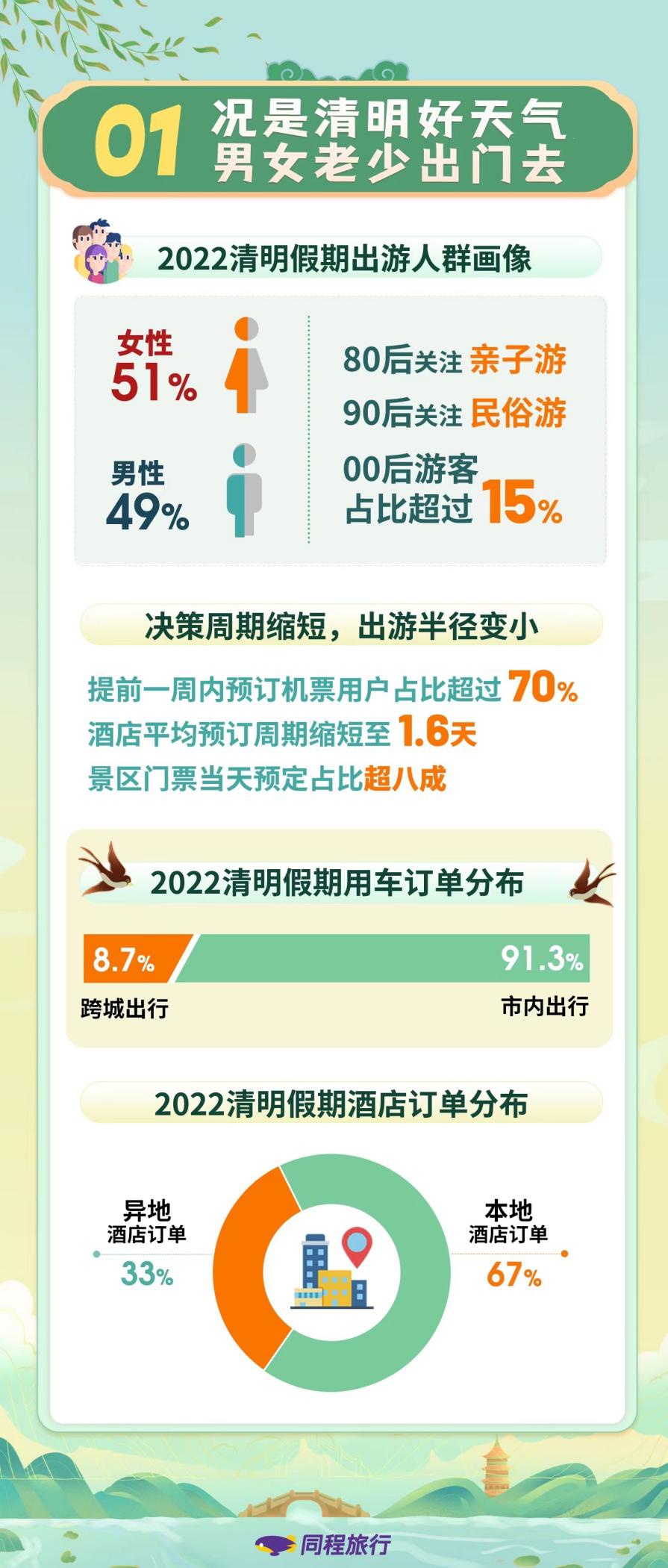 与此同时,人们预订机票、酒店、景区等各类旅游产品的时间周期也进一步缩短,数据显示,清明小长假提前一周内预订机票的用户占比超过70%,酒店平均预订周期缩短至1.6天,而景区门票当天预订的占比超过8成。