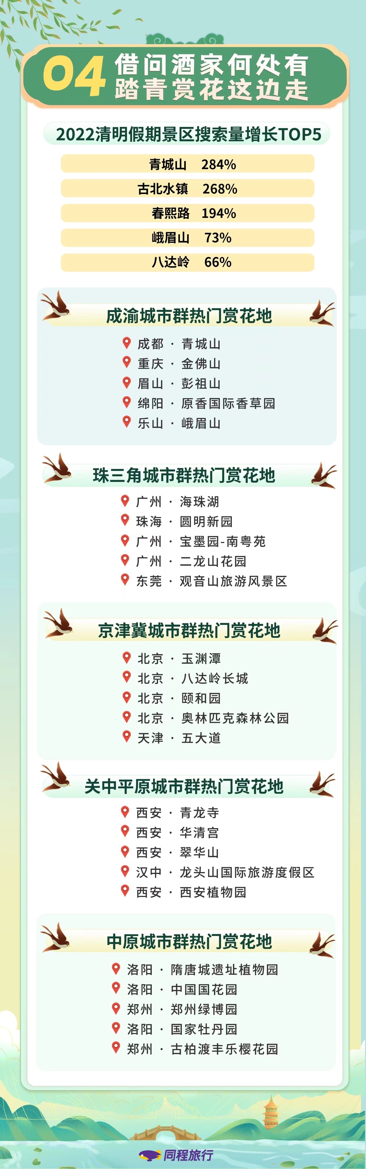 赏花踏青仍是今年清明小长假最热门的出行主题,同程旅行大数据显示,国内不少热门赏花景区搜索量均出现大幅上涨,其中,青城山清明假期搜索量环比上涨284%,古北水镇搜索量环比增长268%。