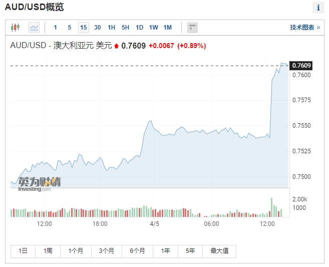 截至发稿,澳元兑美元汇率涨0.89%,至0.7609。