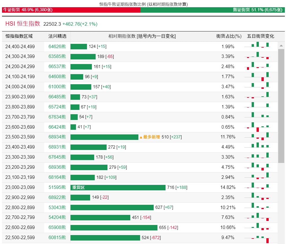 法兴恒指牛熊证街货分布图中的数据显示,熊证街货重货区在23000-23099区间,该区间最新熊证数量为716张,较上一交易日增加188张;最多新增在23500-23599区间,该区间最新熊证数量为510张,较上一交易日增加237张。