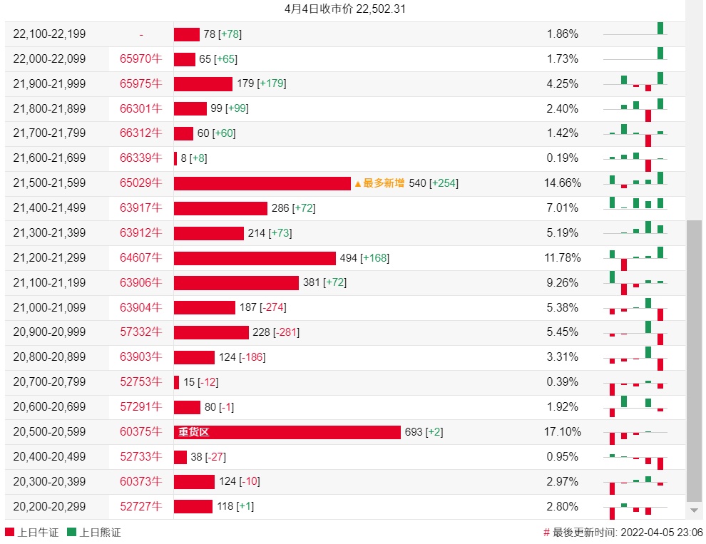 牛证街货重货区在20500-20599区间,该区间最新牛证数量为693张,较上一交易日增加2张;最多新增在在21500-21599区间,该区间最新牛证数量为540张,较上一交易日增加254张。