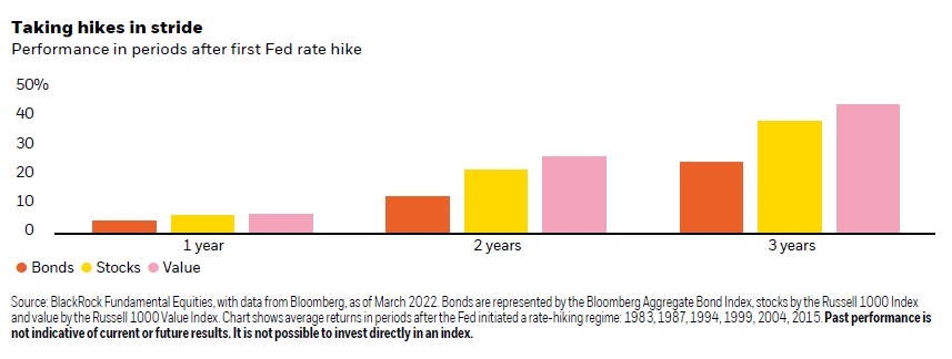 贝莱德通过研究美联储开始加息后的一段时间内股市和债市的表现,发现在能源和金融企业强劲表现的推动之下,股市表现优于其他资本市场,从历史数据来看,价值股领涨美股市场。